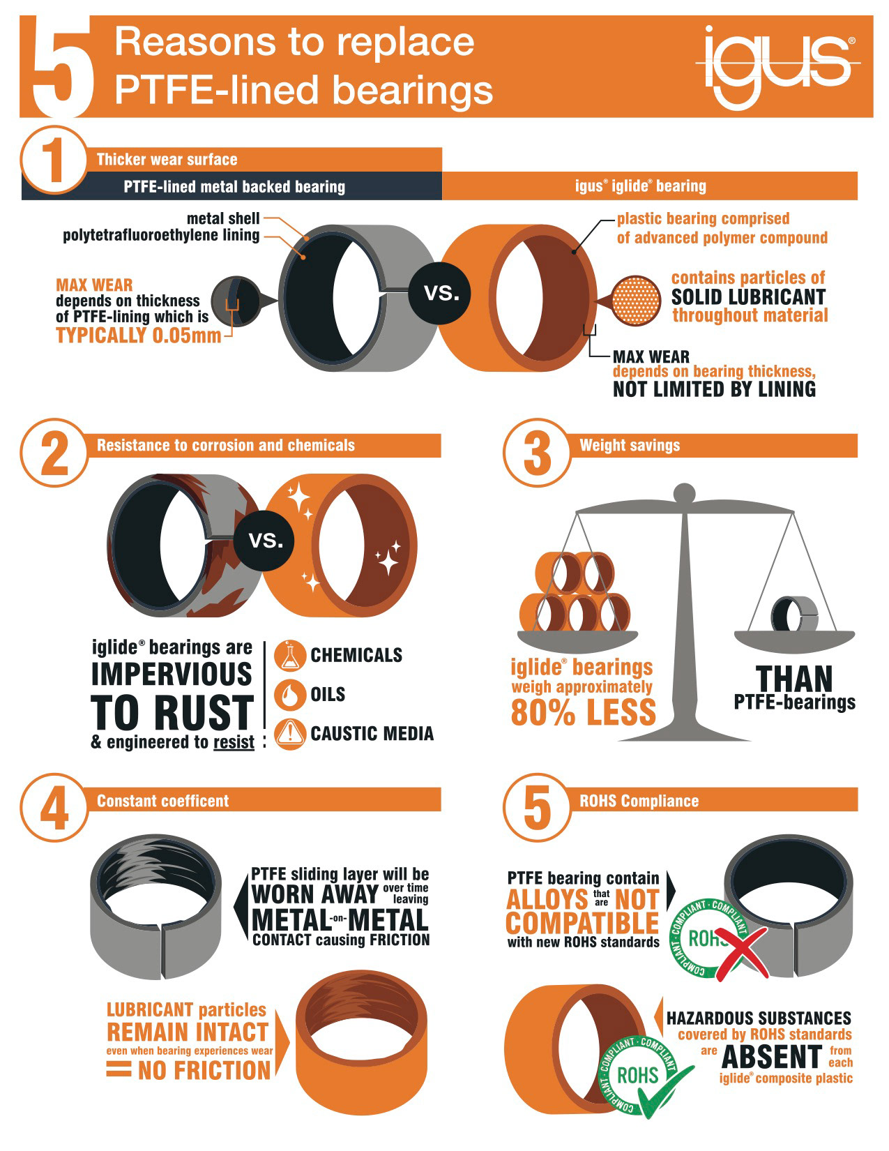Created infographics for Igus to visually display the 5 reasons why customers should replace their PTFE-lined metal bearing to igus iglide bearings.